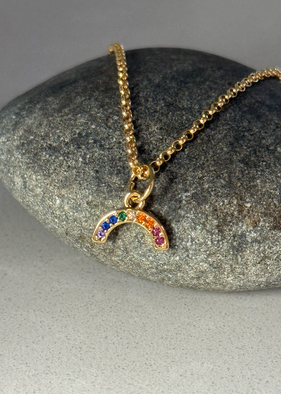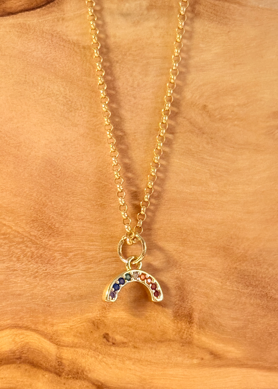 Have some fun with the Rainbow Crystal necklace by Bliss Design! An elegant gold filled and rainbow gem studded pendant on a sturdy 16.5" rolo chain necklace.
