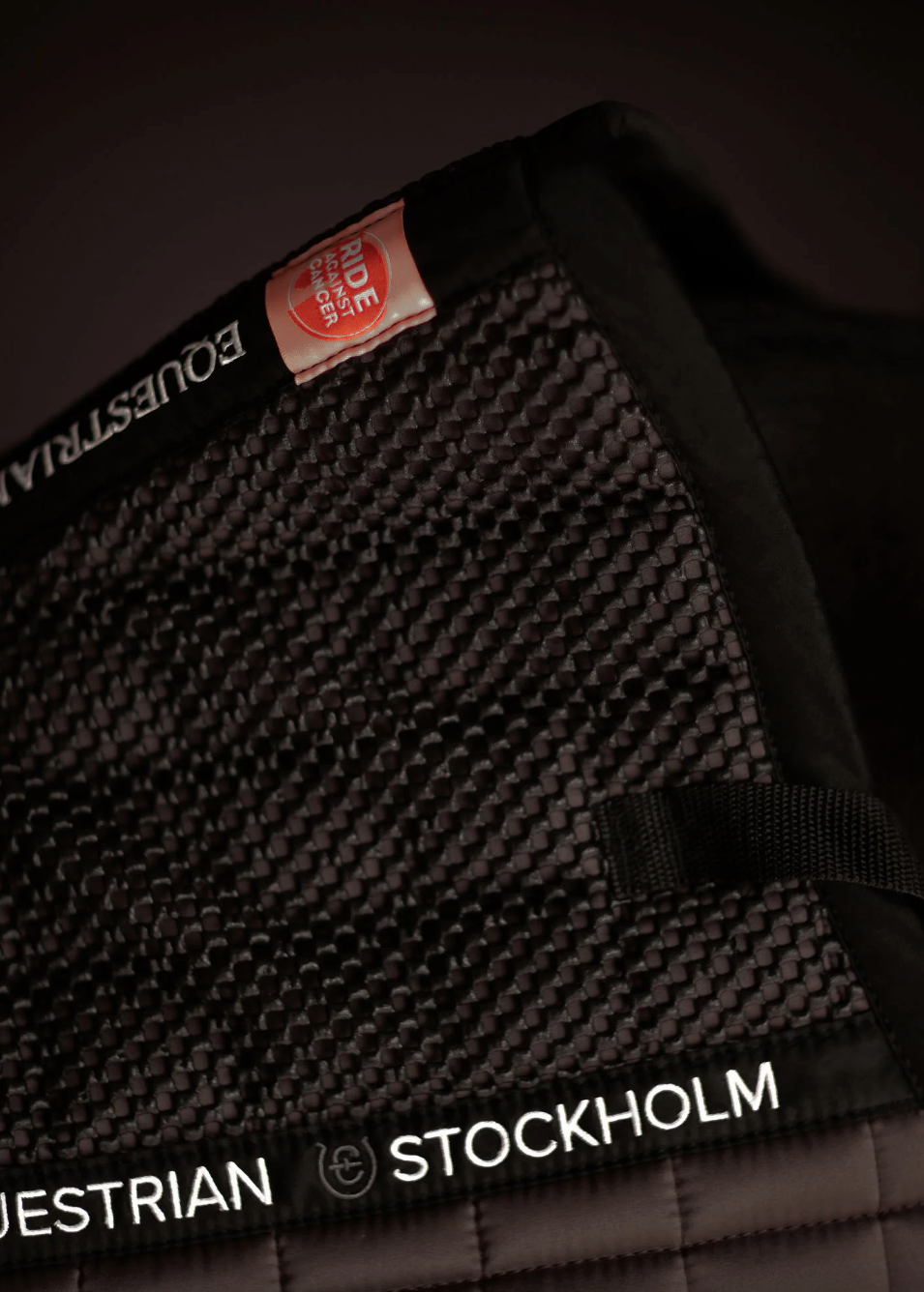 Details: Black top binding with white Equestrian Stockholm logo and ride against cancer label / Cross tape in black with white embroidery / Durable protection patch under the velcro strap by the girth in color black