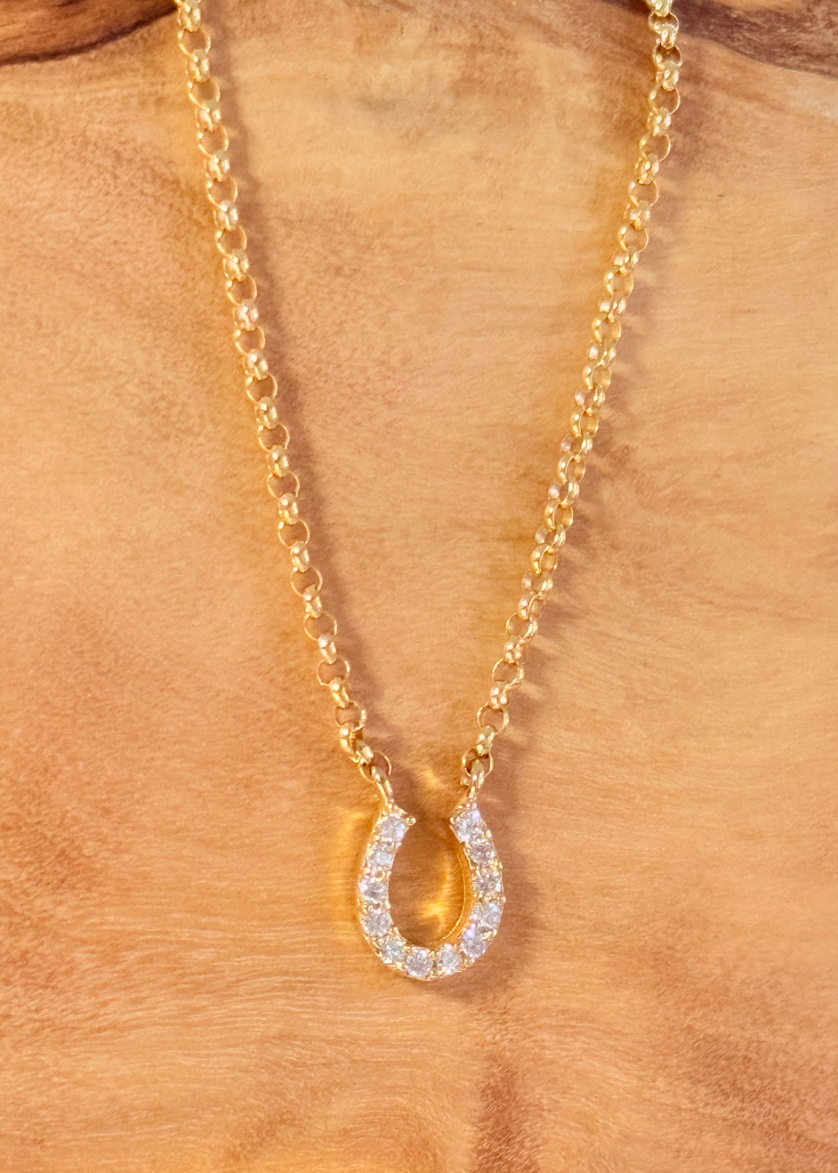 Keep your luck close to your heart with the Crystal horseshoe necklace by Bliss Design. An elegant and solid sterling silver or gold filled pendant on a sturdy 16.5" rolo chain necklace.