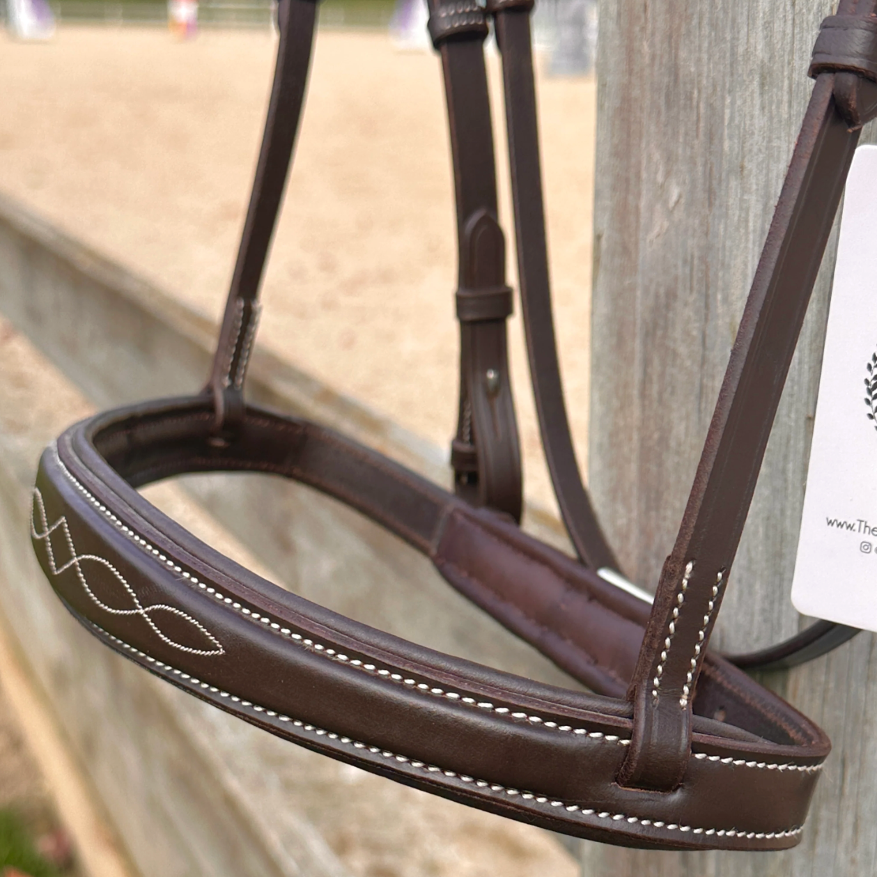 Beautiful and elegant classic styling with white stitching this bridle is always a best seller.  Soft padded nose & browband. We strive for comfort and style in our bridles and this line has it all. Soft padded gently shaped monocrown that is flexible and fits! Equine tested and approved! Reins sold separately.